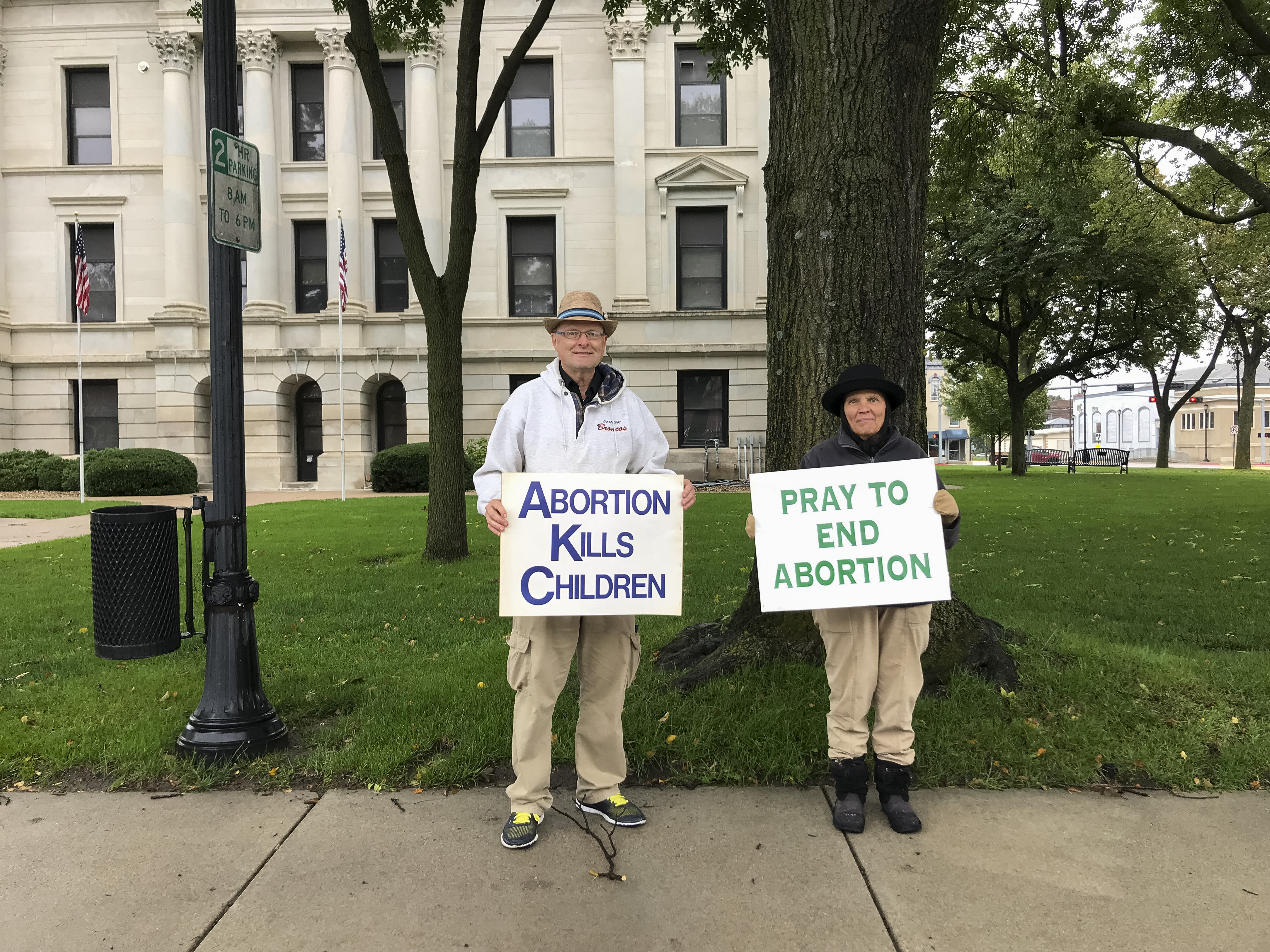 Above: Two Seward residents present signs to people passing by the Seward County Courthouse. Ready-made signs were available for volunteers who wanted to join the Life Chain event on Sunday. Photo by Kim Sleeper.
