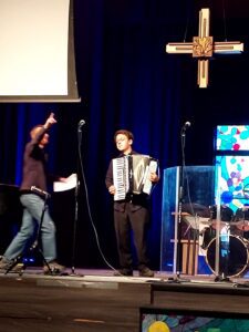 Timothy Baker plays accordion and sings “Carrot Juice is Murder” by Arrogant Worms. Photo: Nora Betts.