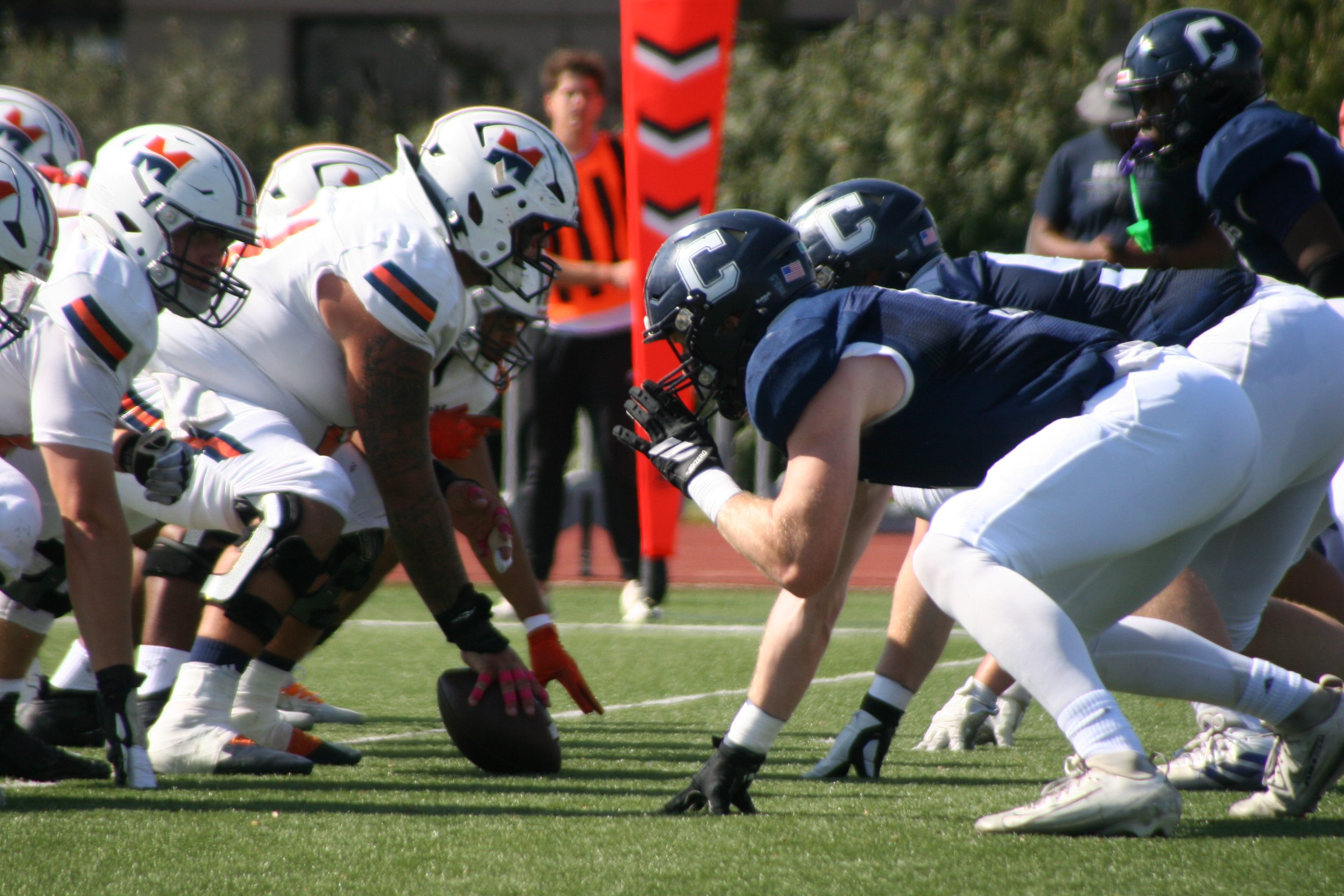 The Concordia football team lines up on the center yard line to begin a play (photo from previous game).