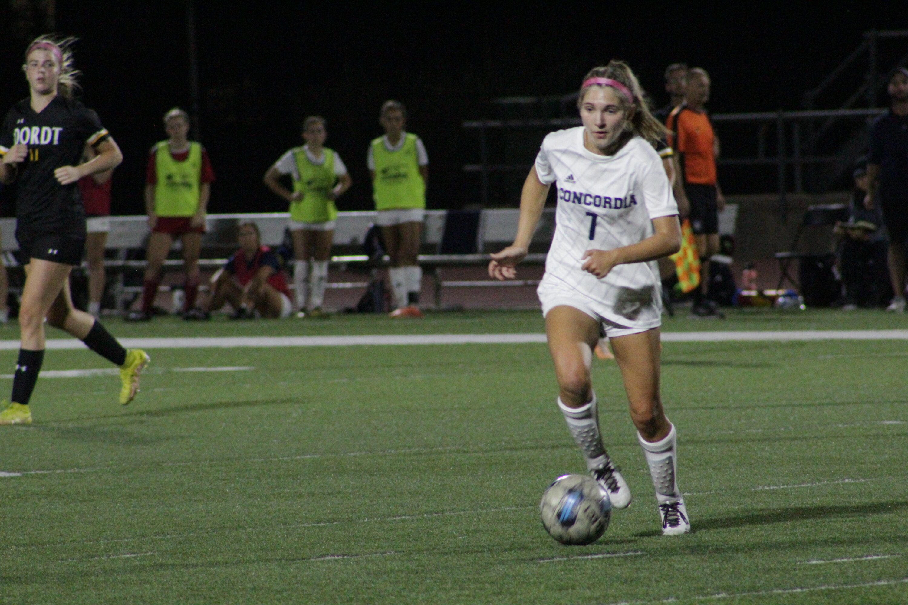 In the Bulldogs’ past two wins, Concordia was able to get on the board first – they continued that trend Wednesday night. Concordia put the first shot on goal a mere minute into the action when sophomore forward Kierstynn Garner charged the goal early and had her shot blocked by Dordt keeper, junior Jenna Wright. Unsatisfied with a mere shot on goal, Garner continued the attack and just five minutes into the game, she finished the job. After a well-placed pass by sophomore midfielder Elena Ruiz found its target close to midfield, Garner torched the Dordt defense and once again found herself face-to-face with Wright. This time, a soft touch off the boot of Garner nudged the ball to the right of Wright and the Bulldogs took a 1-0 early lead.
