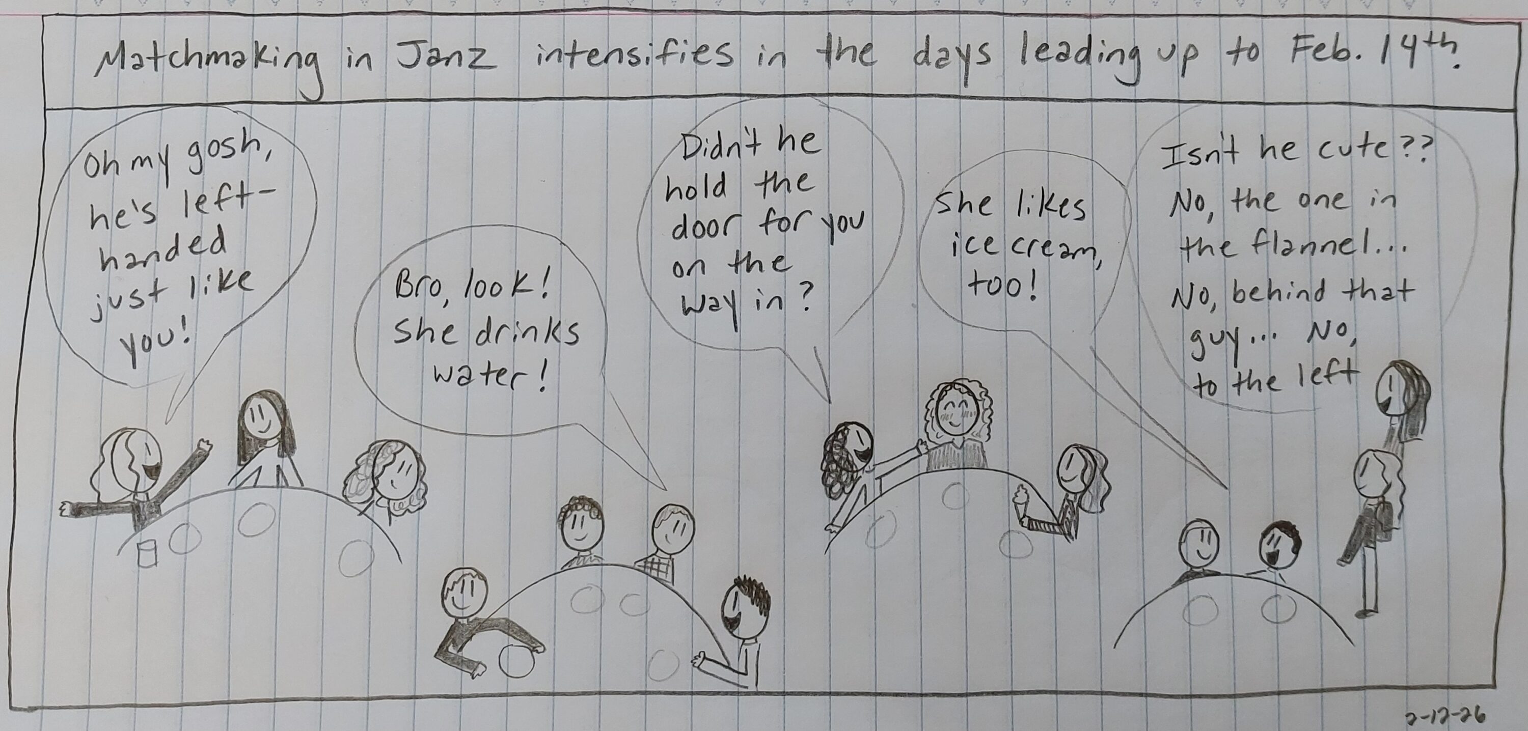 Home Opinion Cartoon by Nora Betts: “Matchmaking in Janz”Cartoon by Nora Betts: “Matchmaking in Janz” ■Cartoon■Opinion■Uncategorizedby The Sower Staff - Feb 12, 20260 11 Submitted by Nora Betts