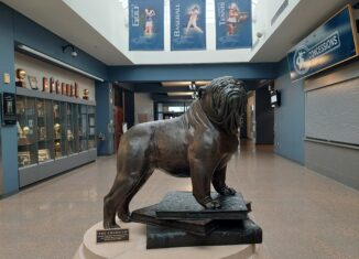 The bulldog statue in the Walz Human Performance Complex. Photo credit: Nora Betts By Kai Olbrich Sports...