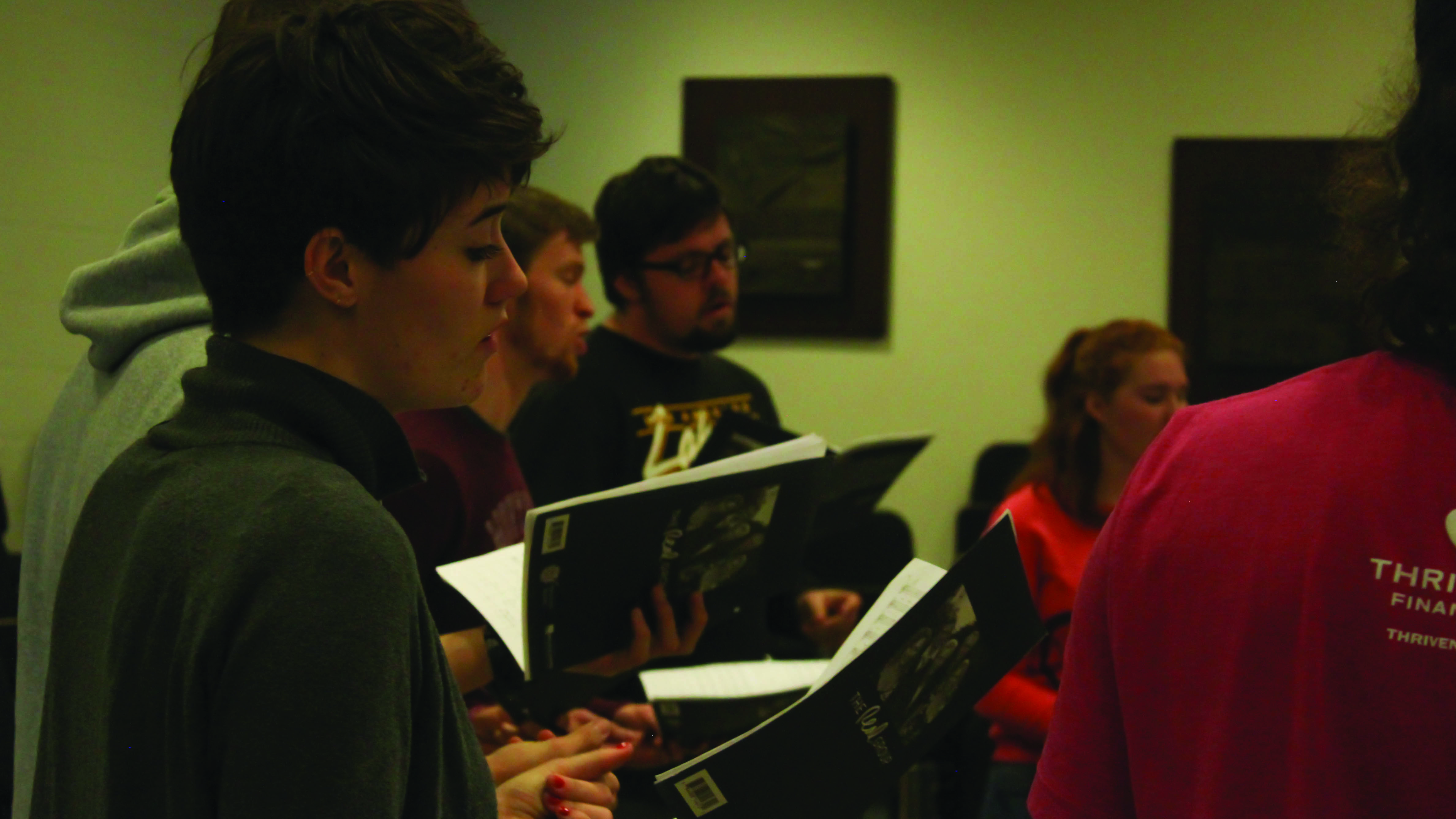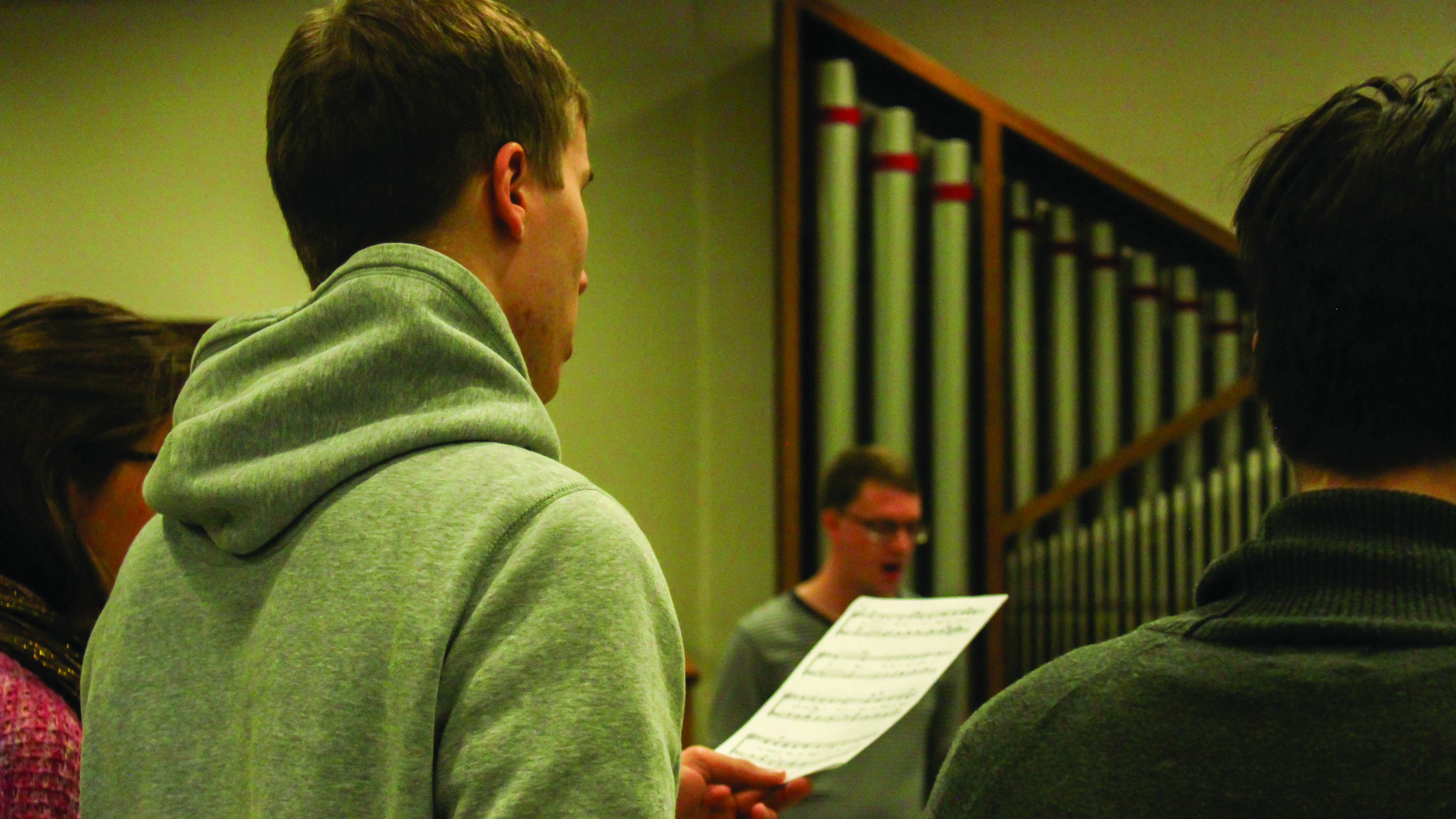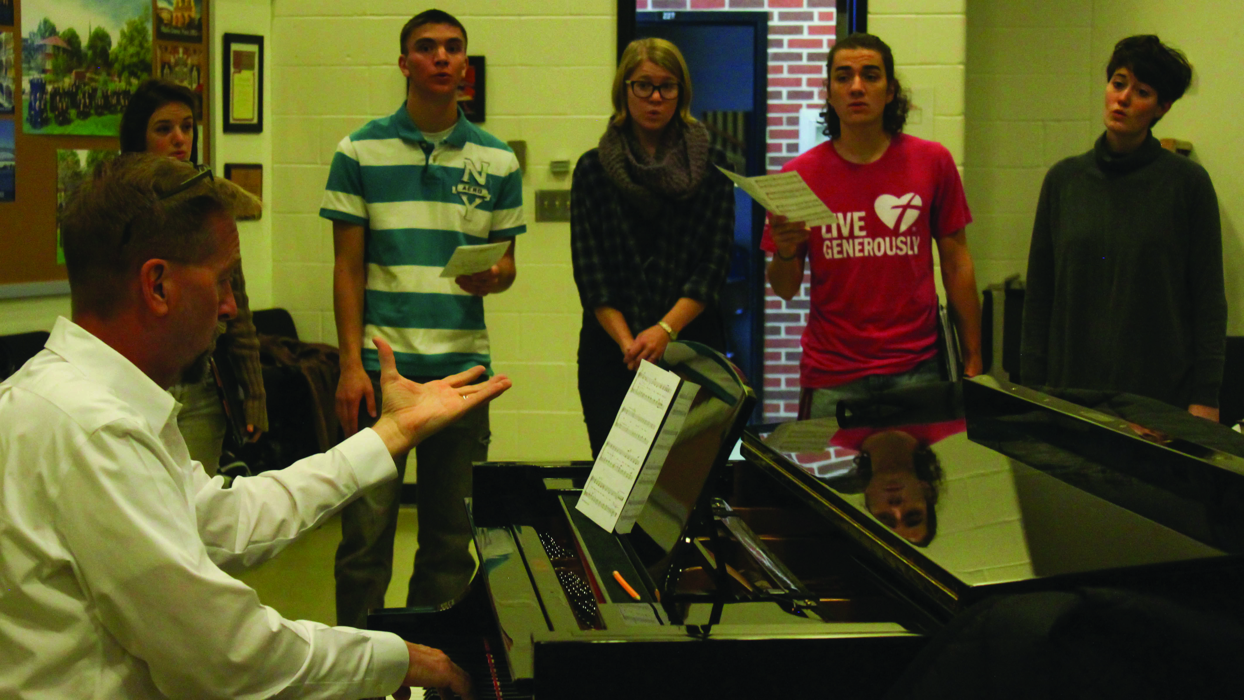 Members of the Concordia Chamber Choir meet with director Dr. Kurt von Kampen to practice for their Christmas concert. Photo by Kim Sleeper.