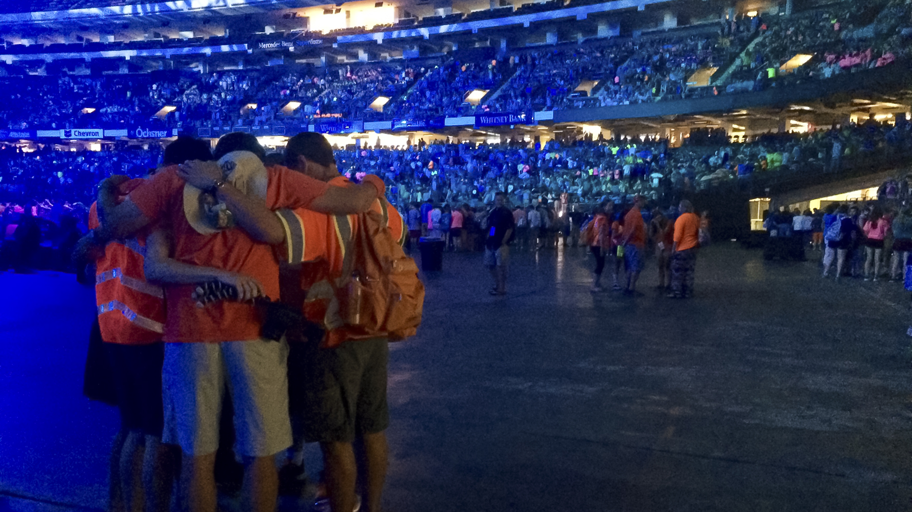 National Youth Gathering volunteers pray amidst a stadium of thousands of gathering participants at the 2016 Gathering.
