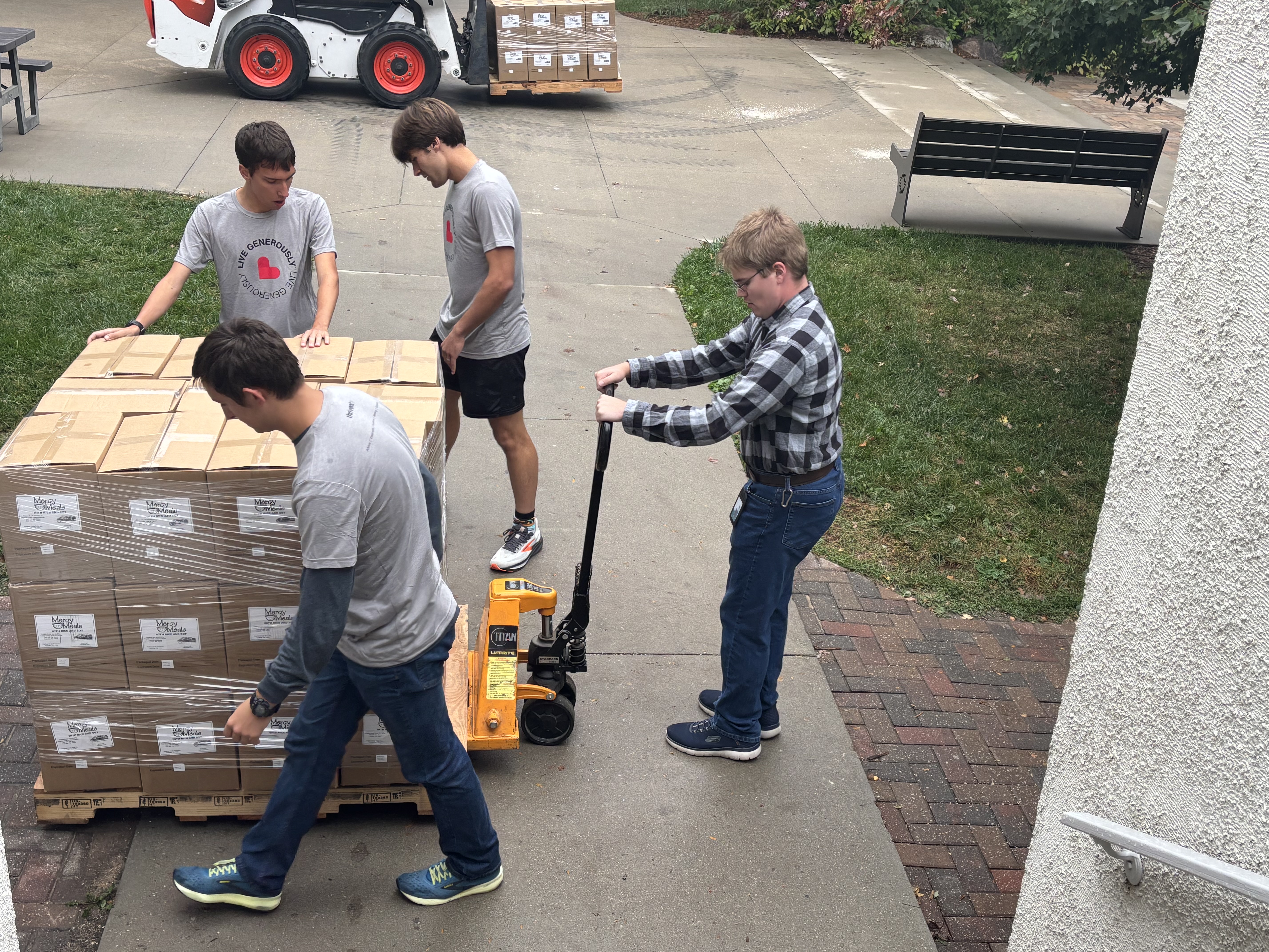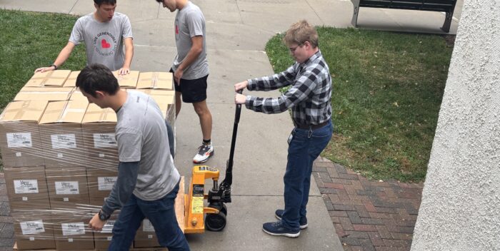 Student volunteers move a pallet full of meal boxes up the ramp to the top level of the Janzow Campus Center.