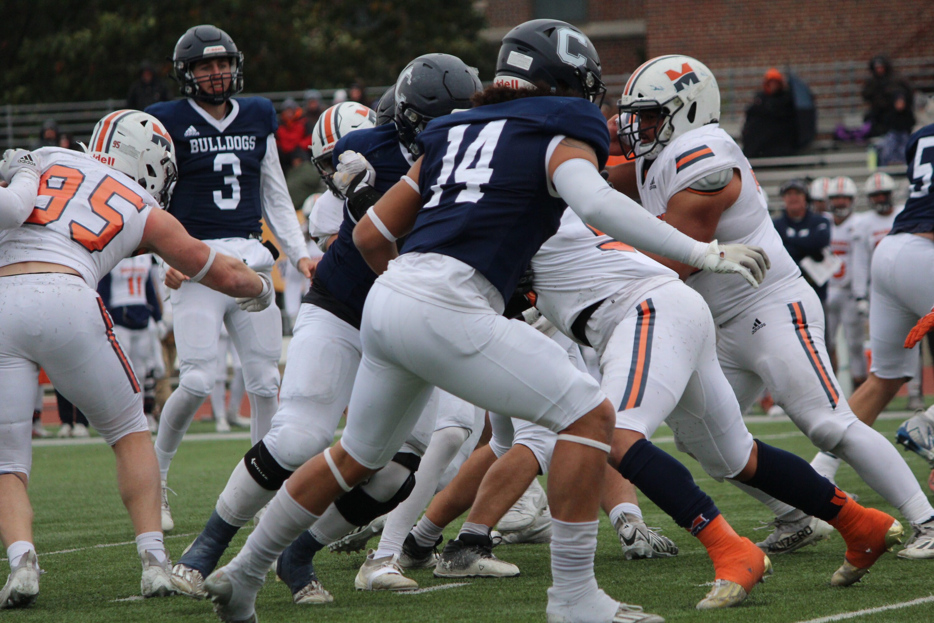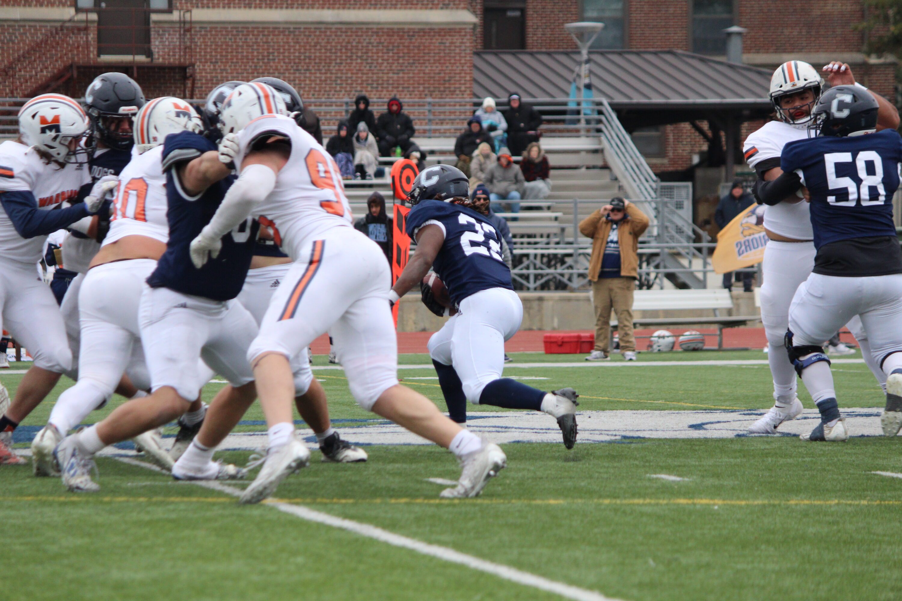 - Junior, Jake Jablonski, trying to avoid a tackle with his teammates helping to block the defensive team.