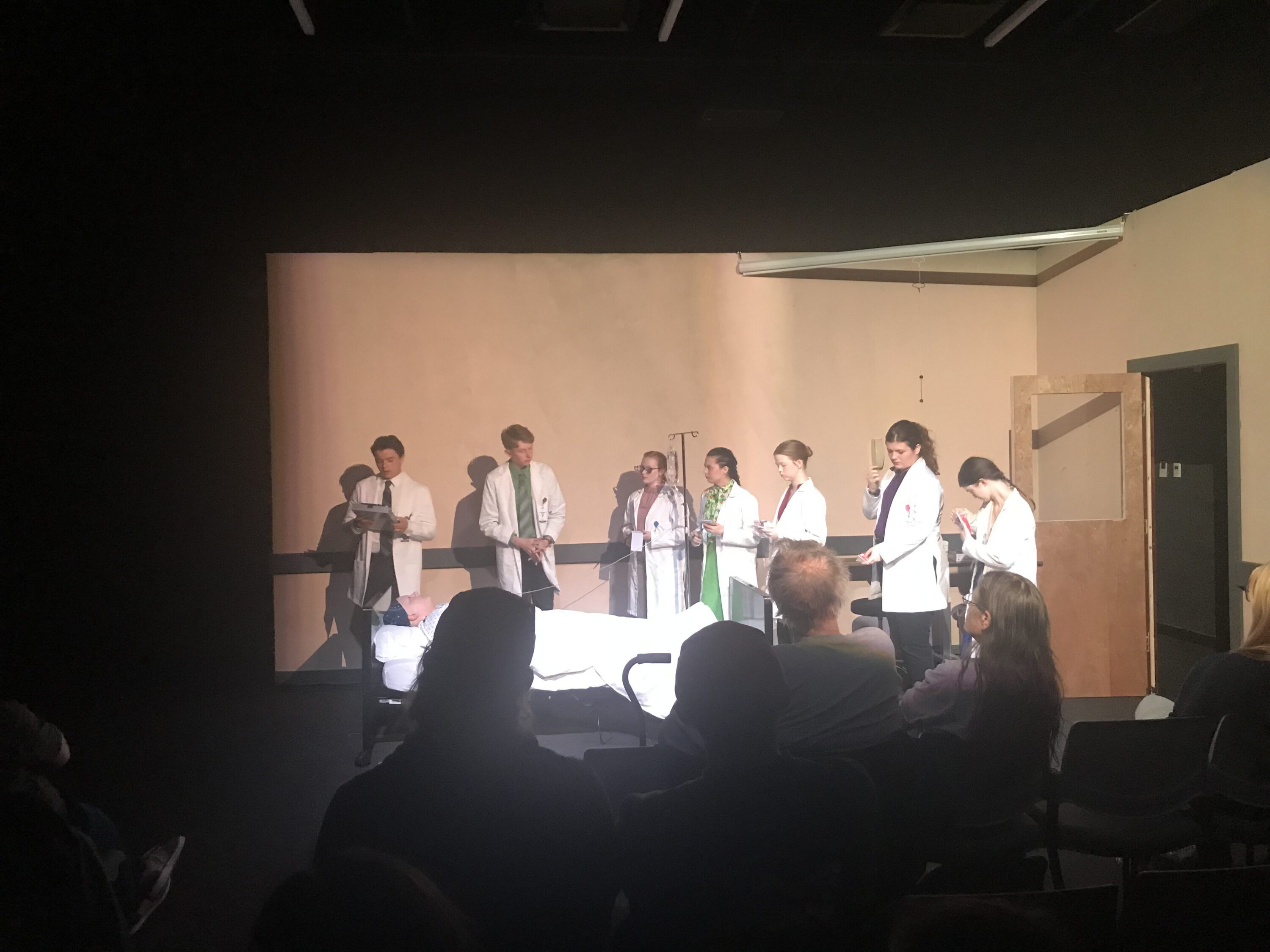 Dr. Kelekian (Duncan Carrasco, left) uses Dr. Bearing’s cancer case as a lesson for his fellowship students (left to right: Aydan Toth, Maddie Kearns, Mi-Ree Zwick, Delaney Baker, Emily Hunt, and Kristen Welling).