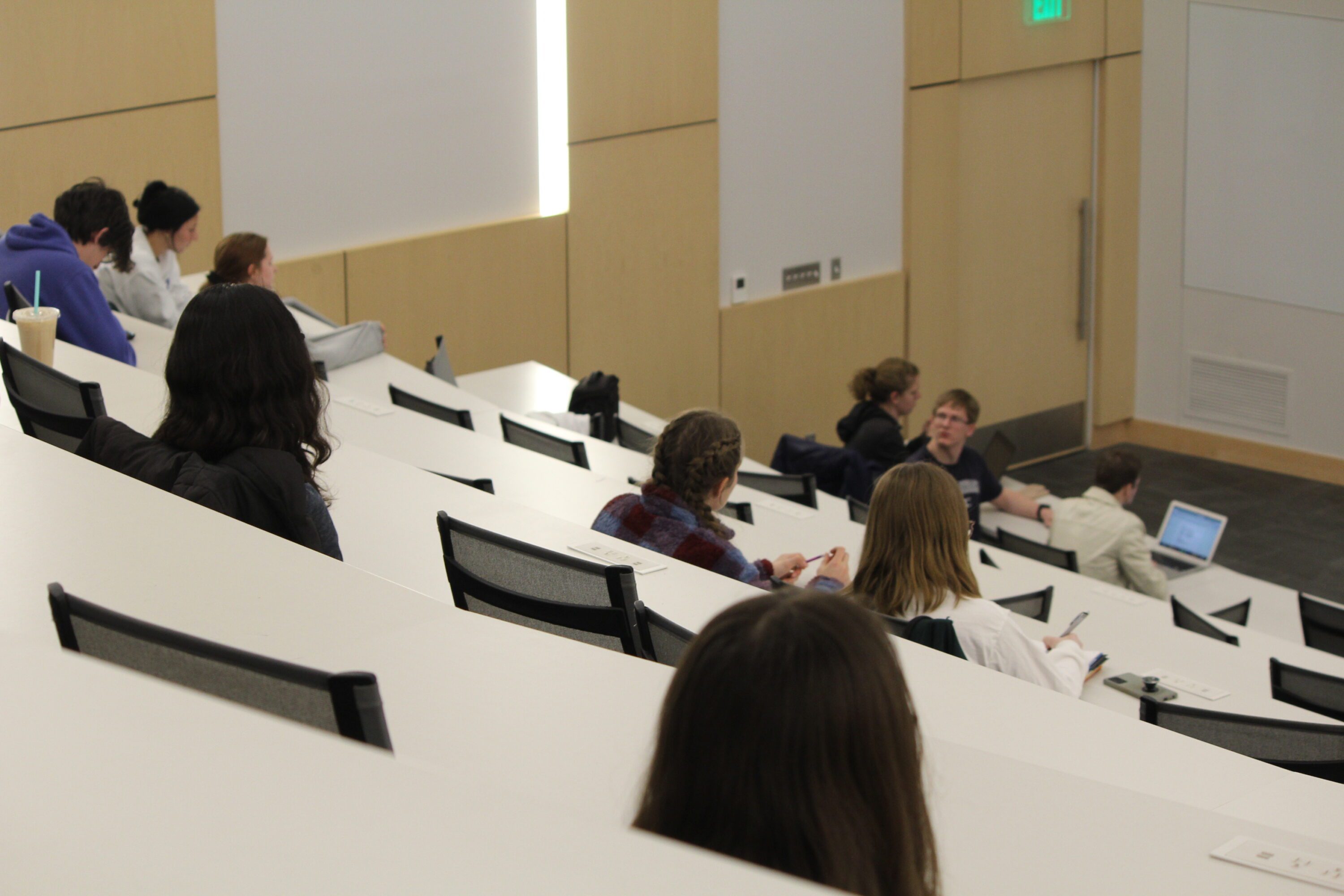 A view from the top of the Dunklau lecture hall of students at a Student Senate meeting.