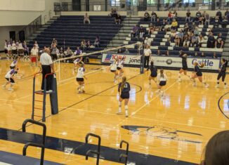 Sophomore middle Maddie Paulsen and junior outside hitter Ella Waters move to catch a...