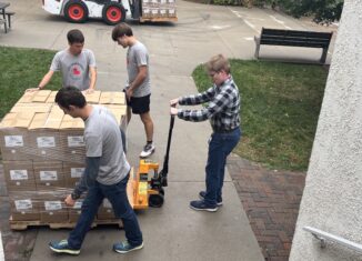 Student volunteers move a pallet full of meal boxes up the ramp to the...
