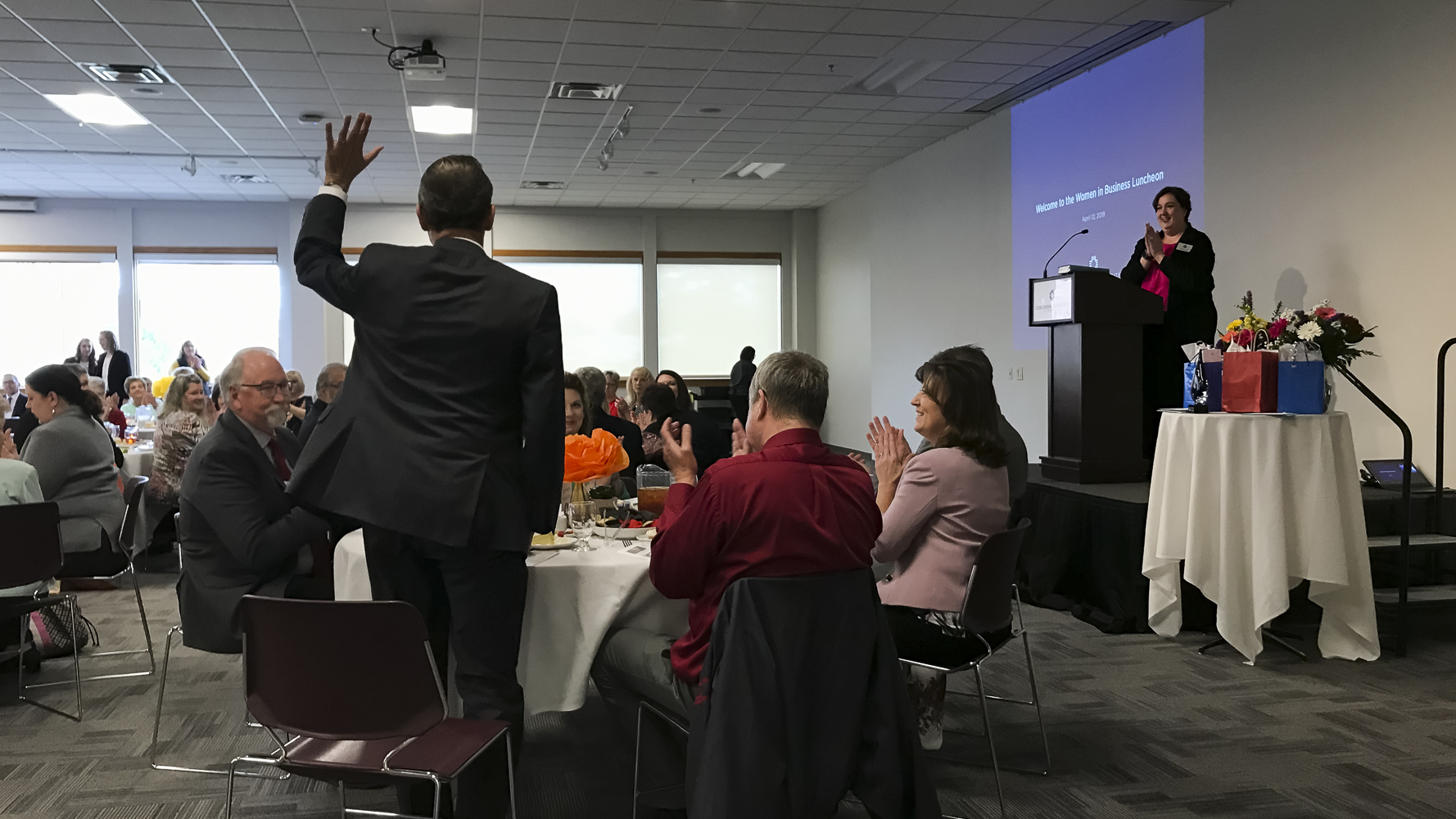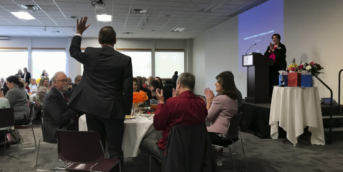 President Friedrich waves to attendees of Women in Business Luncheon before getting up to speak. Photo by Kim Sleeper.